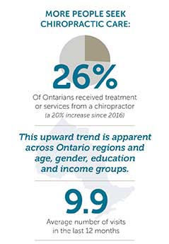 An Environics Research Group study we commissioned on ‘Attitudes of Ontarians Toward Chiropractors’ found that 26 per cent of Ontarians received treatment or services from a chiropractor in the 12 months between May 2018 to May, 2019.