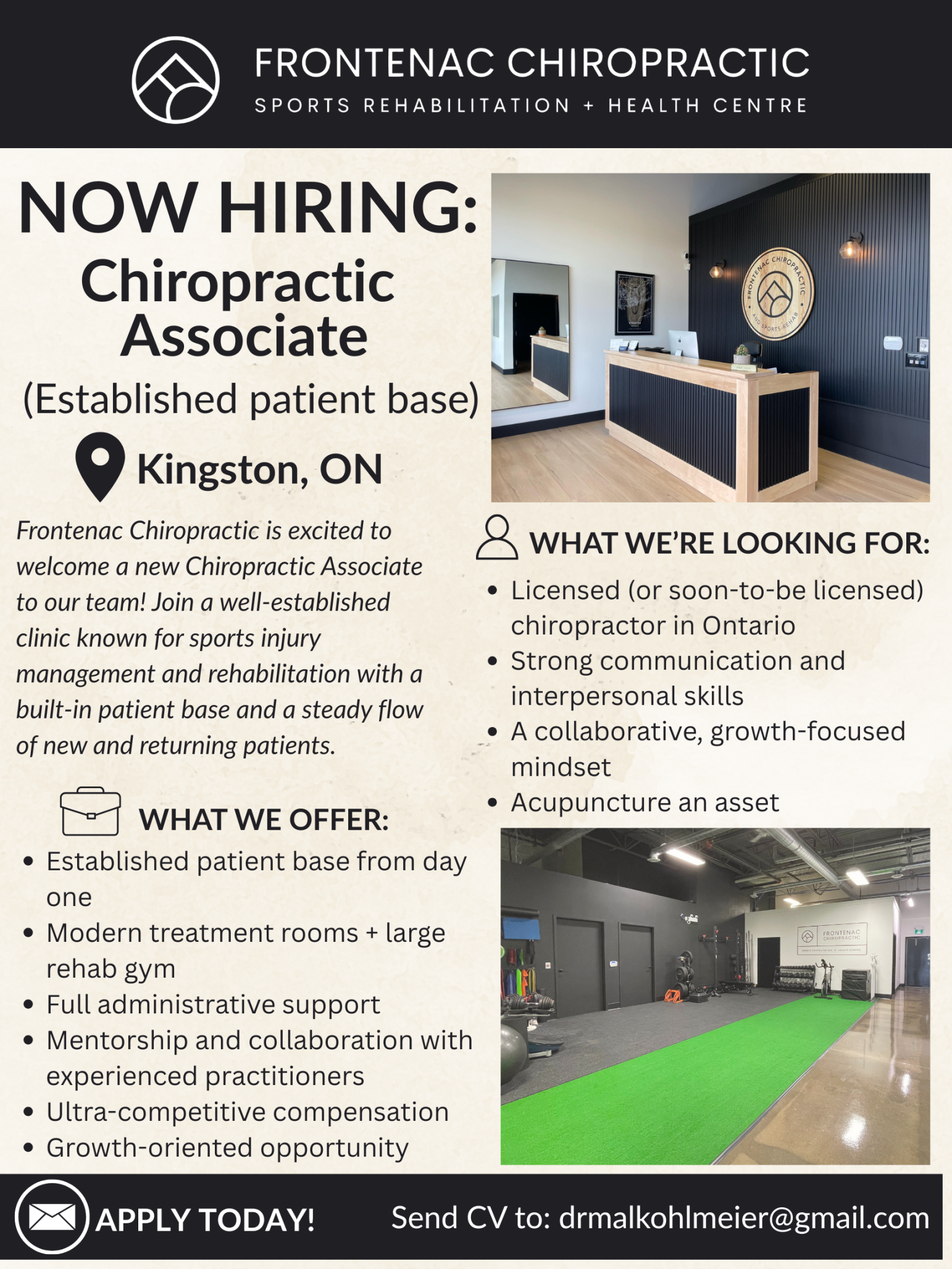 Frontenac Chiropractic and Sports Rehab is a clinician-owned multidisciplinary practice in Kingston, Ontario that is looking to add an evidence-based chiropractor with an interest in sports injuries to our team.