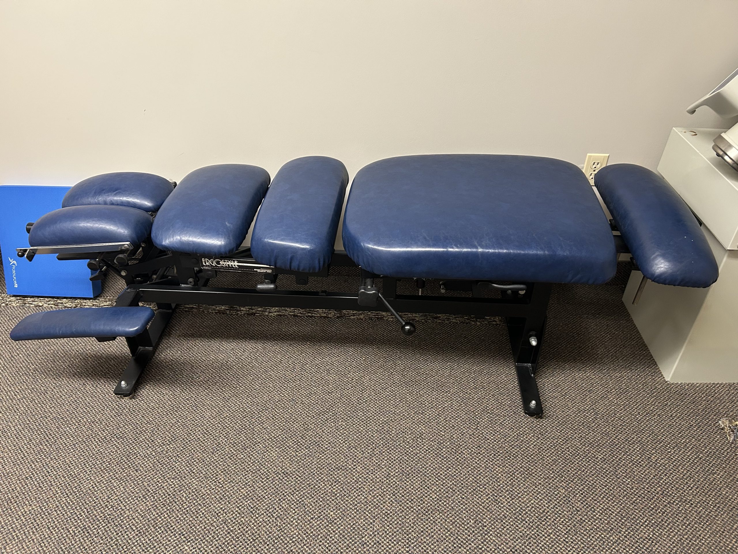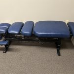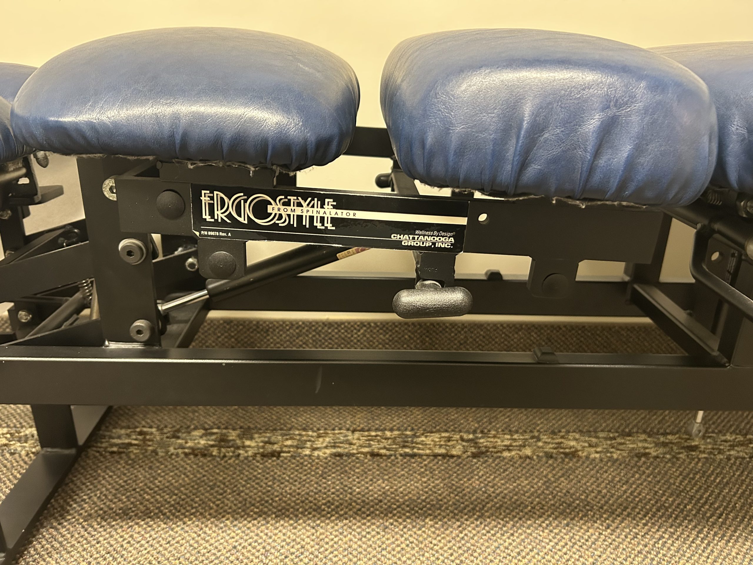 Ergostyle from spinalator chiropractic table for sale. 23″H x 21″ W x 72″ L. Has lumbar and cervical drops. Thoracic piece has tenting feature. Extendable leg rest. Lumbar tenting piece hydraulic does not work.