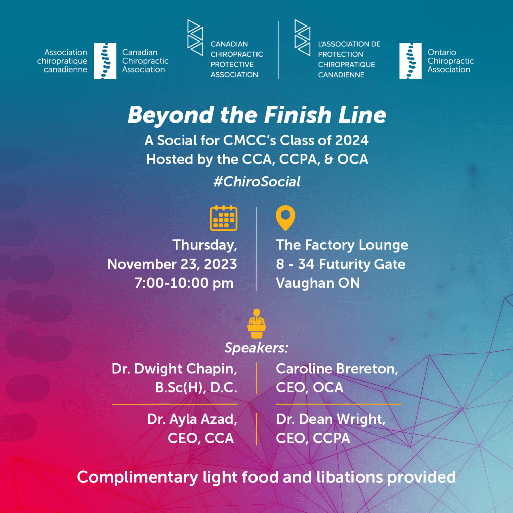 A Social for CMCC’s Class of 2024 – The Canadian Chiropractic Association (CCA), Ontario Chiropractic Association (OCA), and Canadian Chiropractic Protective Association (CCPA) are pleased to join forces and celebrate the CMCC graduating class as you move closer to joining the chiropractic profession!