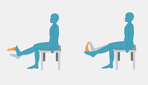 • Sit upright, hold on to the side of the chair and straighten your left leg with your foot on the floor. • With leg straight and raised, point your toes away from you. • Point toes back towards you. • Try two sets of five stretches with each foot.