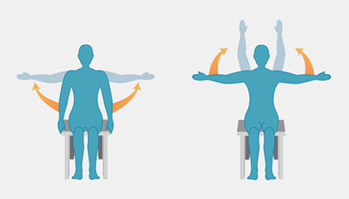 • Sit upright, arms by your sides. • With palms forwards, raise both arms out and to the side and up as far as is comfortable. Then return. • Keep your shoulders down and arms straight throughout. • Breathe out as you raise your arms and breathe in as you lower them. • Repeat five times.
