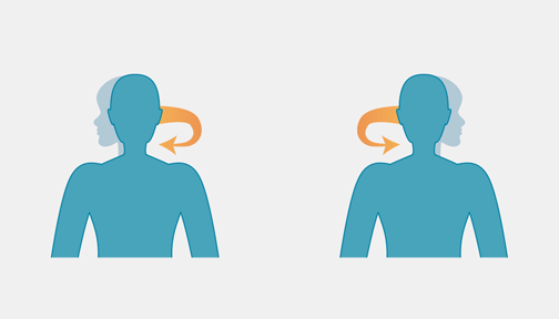 • Sit upright with shoulders down. Look straight ahead. • Slowly turn your head towards your left shoulder as far as is comfortable. • Hold for five seconds and return to starting position. • Repeat going right. • Do three rotations on each side.