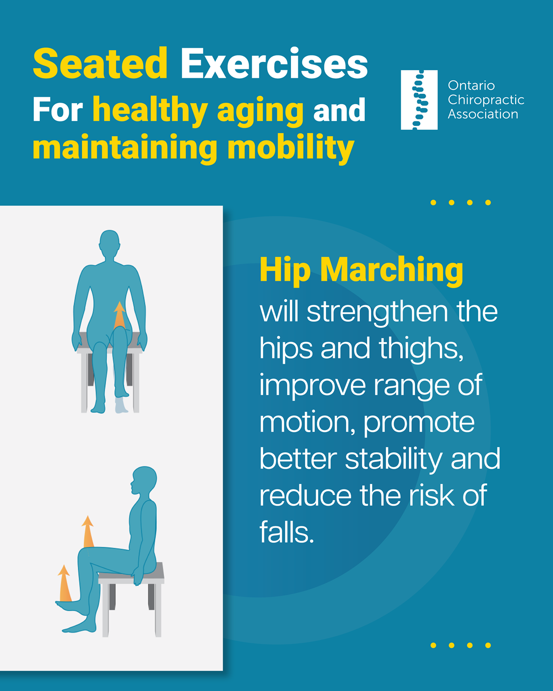 Hip marching Strengthens the hips and thighs, improves range of motion, promotes better stability and reduces the risk of falls.