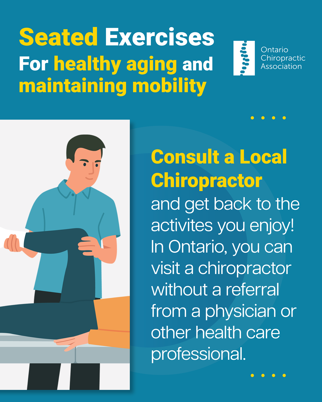 To support healthy aging and maintain mobility, visit a chiropractor! In Ontario, you can visit a chiropractor without a referral from a doctor, nurse practitioner or other health care professional. To find a chiropractor near you, use the chiropractor locator on our website.
