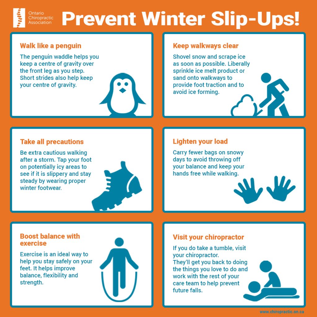 You can’t control the weather, but you can improve your balance through regular exercise. Exercise is an ideal way to help you stay safely on your feet because it helps improve balance, flexibility and strength. Talk to a chiropractor about ways to improve your balance and strength in order to prevent falls.